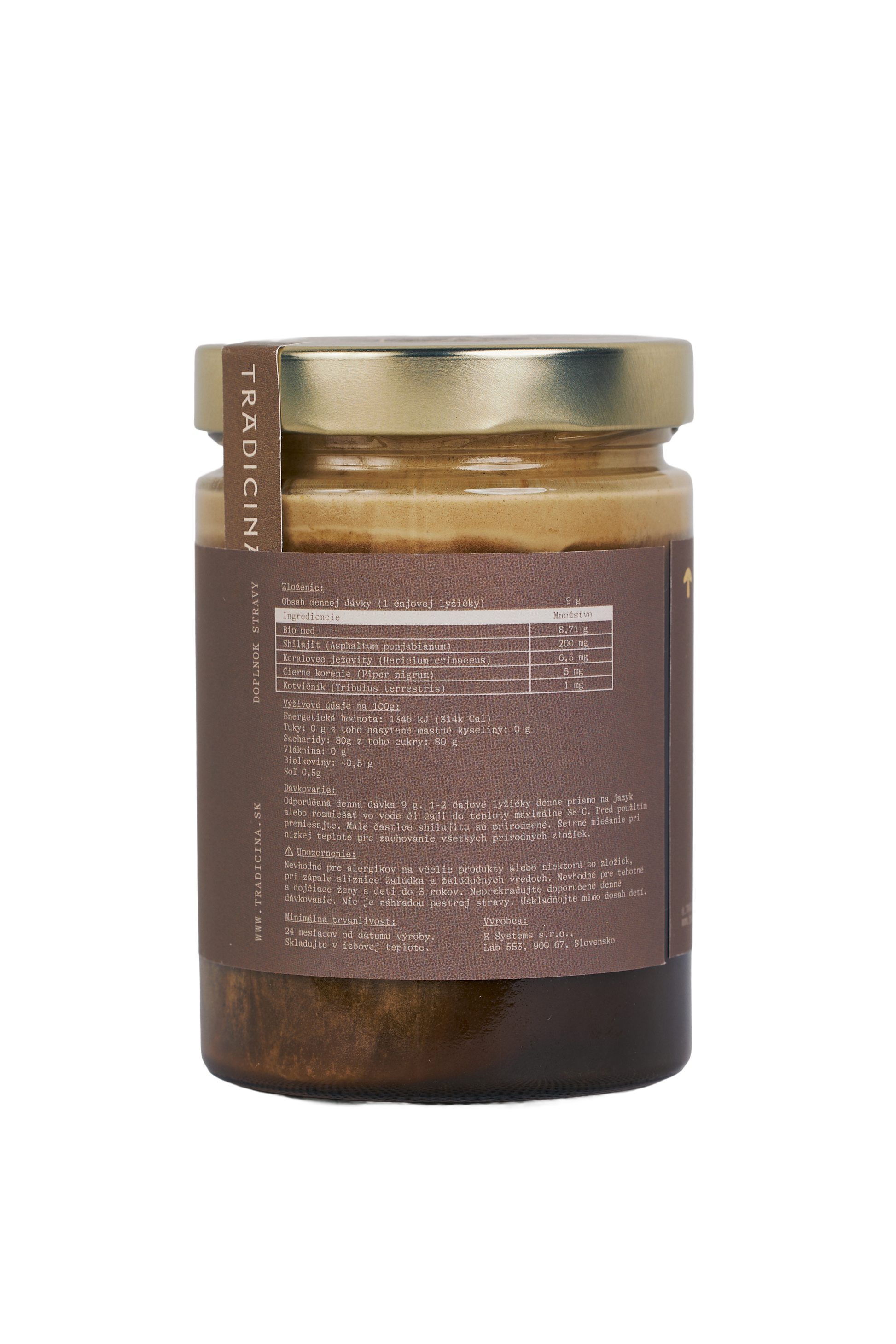 Tento elixír spája silu himalájskeho Shilajitu/Mumio s koralovcom ježovitým (Hericium erinaceus), kotvičníkom (Tribulus terrestris) a čiernym korením (Piper nigrum), ktoré zvyšuje vstrebateľnosť účinných látok.